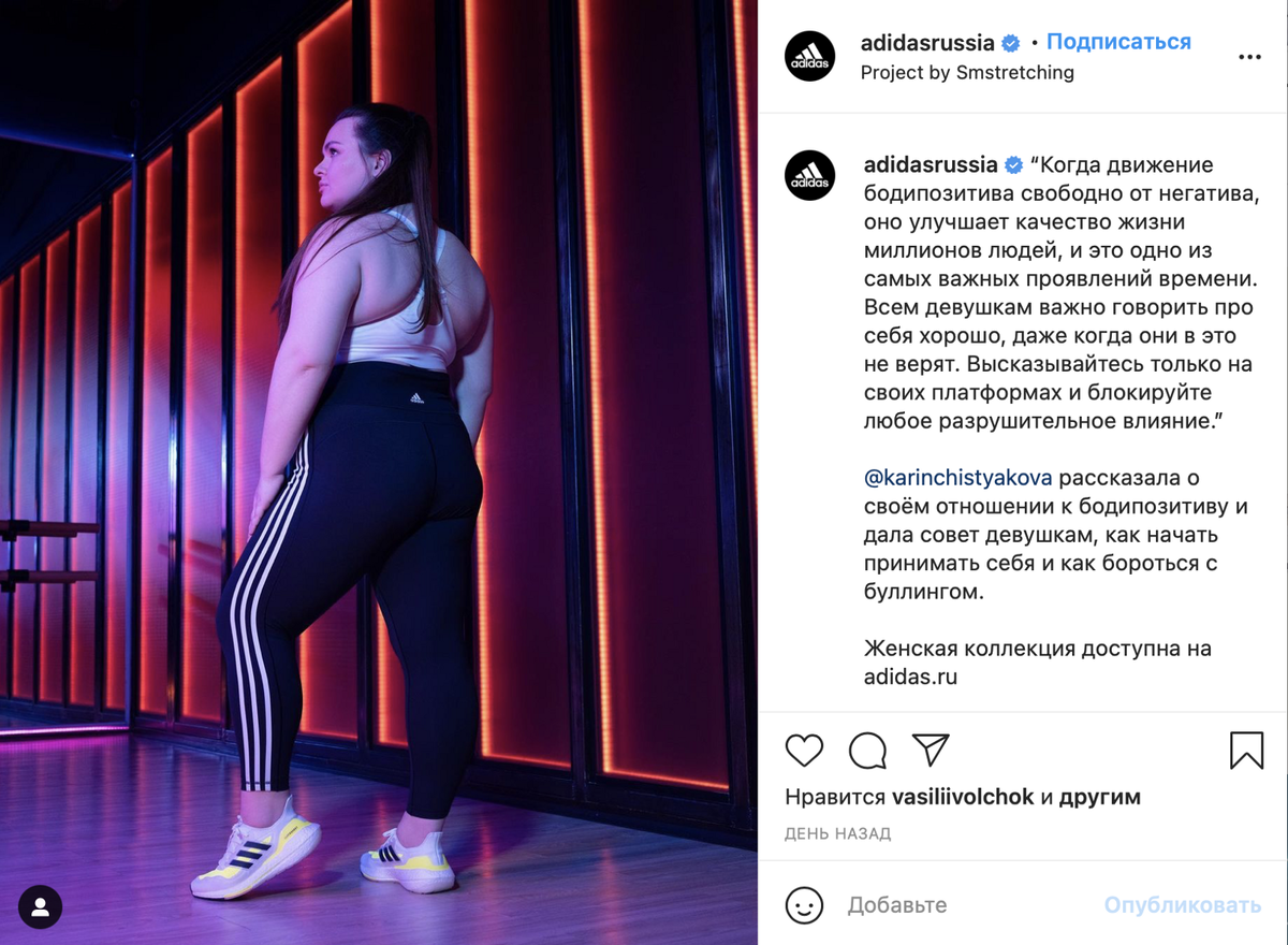 Мне прислали пост Adidas в Instagram с комментарием, призывающим возмутиться: «Как они могут говорить о бодипозитиве, если снимают девушек plus-size в невыгодных ракурсах и при плохом освещении? Моделей стандартной внешности они фотографируют куда красивее! Это лицемерие — показывать людей в меньшем размере одежды в более привлекательном свете!»
