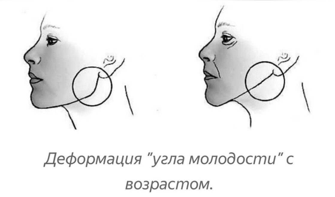 К чему тут угол молодости?Вся костная масса черепа является своеобразной рамкой,на которую послойно нанизаны различные слои:фасции,ПЖК,связки,мышцы,кожа и т.д.В возрастом происходит резорбция черепа(усыхания костной массы и уменьшение ее в размере),и эта рамка начинает сжиматься.Кости принимают иное положение и увы,невыгодное для красоты,но выгодное им для компенсации нагрузки,получаемой извне.Челюстная дуга меняет свой наклон,угол молодости сглаживается и уже далек от заветного градуса 100-110.а верхняя челюсть неуклонно стремится встретится с нижней,стягивая и спазмируя ее,отчего та поднимается вверх,превращая лицо в «бабку-ёжку»