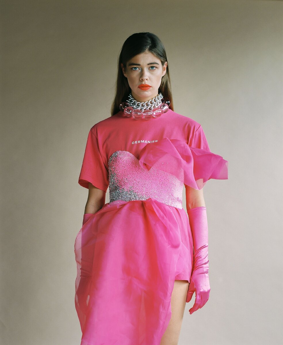 Вдохновляя заботу и мастерство ранних кутюрье, швейцарский дизайнер Kévin Germanier создал новый подход к современной роскоши, который уменьшает количество отходов. Во время работы в Гонконге он происходил на мешках из бисера, которые были отвергнуты за неправильный цвет и предназначались для свалки. Парижский дизайнер купил сумки и приложил тысячи шариков к своим предметам одежды — все из которых выросли или состояли из устойчиво сделанных тканей. Результатом является коллекция ослепительных платьев, пошив и джинсов с его ярким украшением подписи, которое создает новый подход к устойчивости.