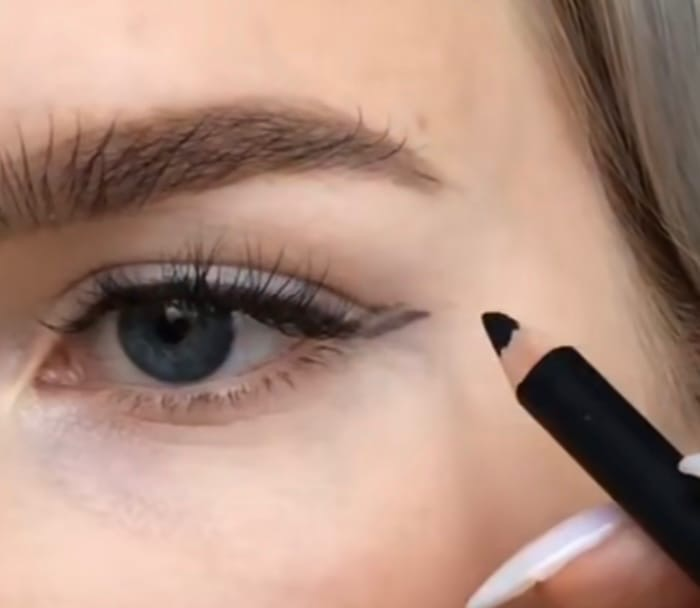 ШАГ 1 . от конца складки века отступаем пару миллиметров , и начинаем рисовать основание нашей стрелки , под углом примерно 43 градуса