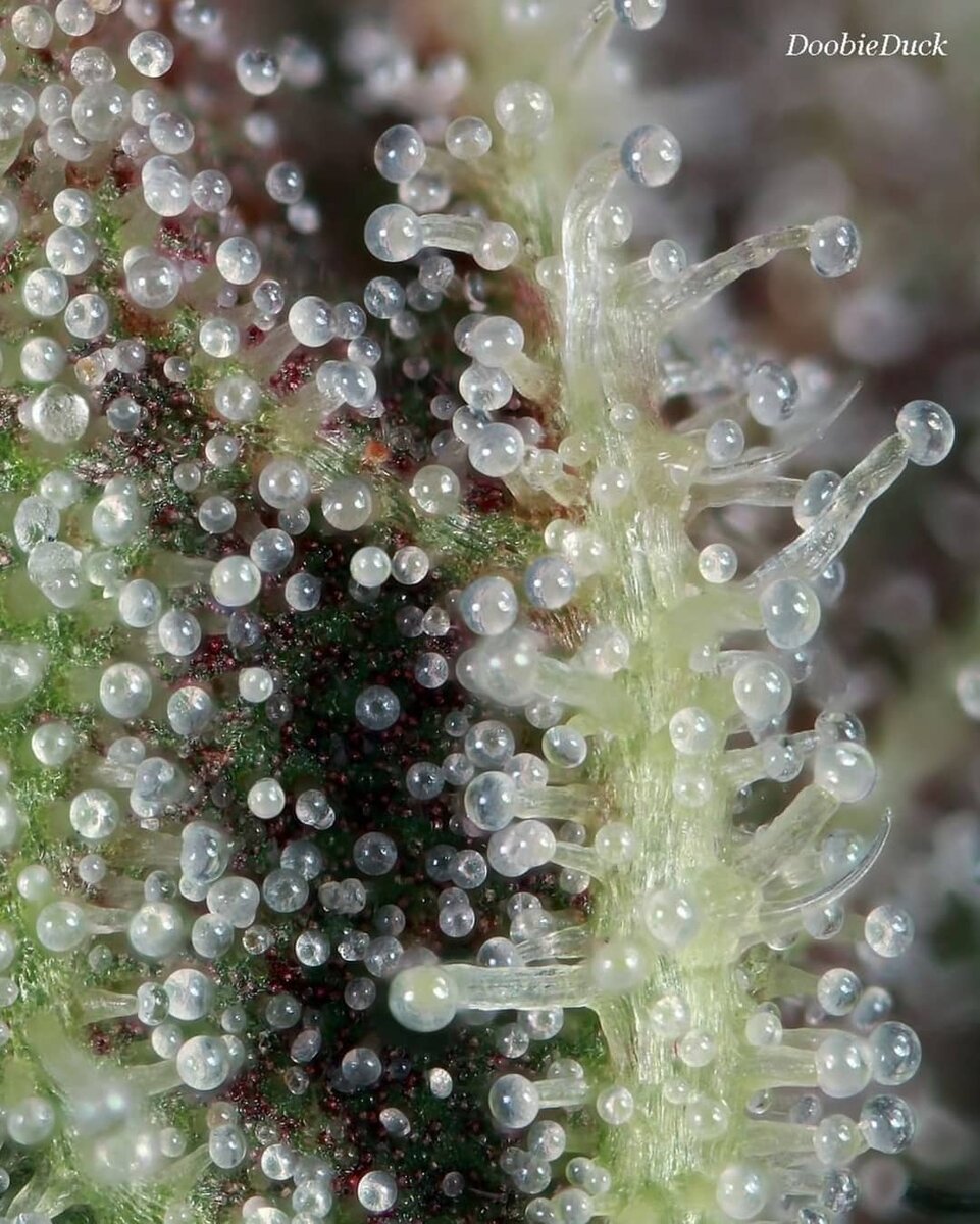 Если внимательно присмотреться, то на поверхности куста каннабиса можно заметить огромное количество желез, выделяющих смолу. Они называются трихомами и образуются исключительно клетками эпидермы. Именно трихомы в первую очередь ответственны за выработку каннабиноидов — главных психоактивных компонентов марихуаны. Если какой-либо сорт усыпан этими железистыми отростками, как снегом, то можно с уверенностью сказать, что он будет очень мощным.