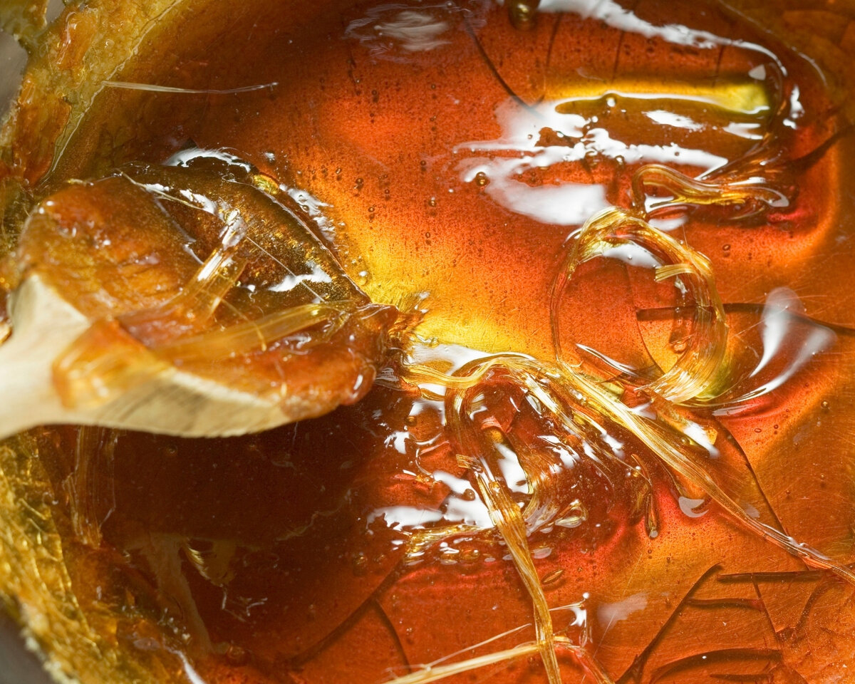Дождитесь, когда смесь станет медово-жёлтой, цвета светлого пива, и снимите с плиты.