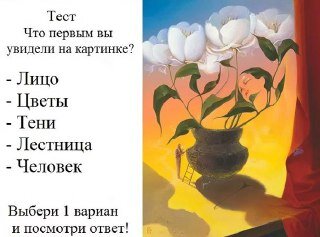 Перед вами — популярный визуальный психологический тест. Он работает по принципу оптической иллюзии: ваш мозг мгновенно выбирает из множества деталей изображения ту, которая подсознательно кажется ему наиболее значимой. Этот выбор может многое рассказать о вашем текущем эмоциональном состоянии, скрытых переживаниях и даже о том, на что направлено ваше внимание в жизни.