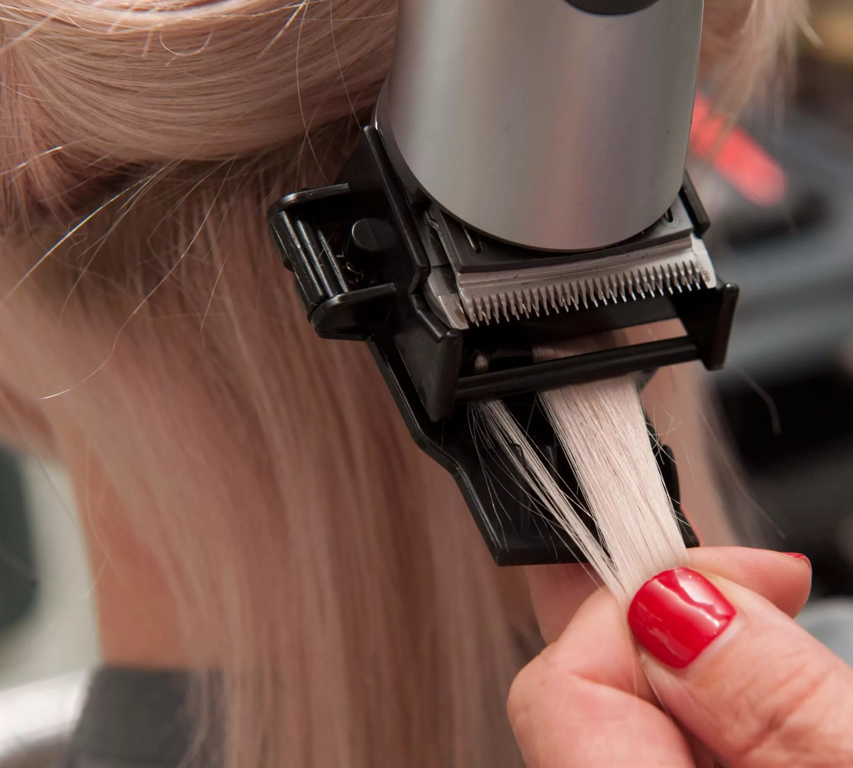 3. Полировка с помощью специальной машинки. Начиная с затылка машинкой проводят по каждой пряди 3-4 раза для максимального эффекта. Машинка срезает полностью все торчащие концы как здоровые, так и секущиеся. Причем, делается это по всей длине.