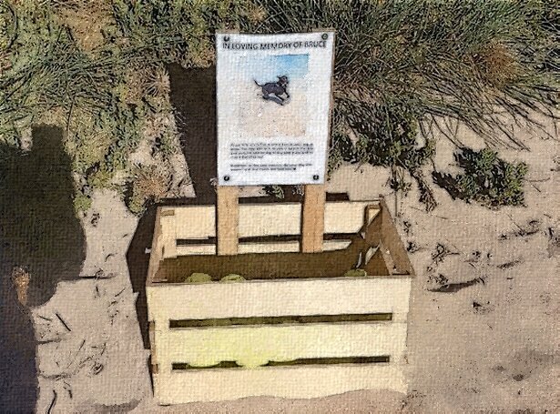 На пляже «Серебряные пески» в Южной Австралии появился трогательный памятник, посвящённый собаке по кличке «Брюс». Стенд установила скорбящая хозяйка пёсика. Он включает в себя фотографию Брюса, резвящегося в воде, показывающую, как сильно он любил этот пляж, когда был жив.