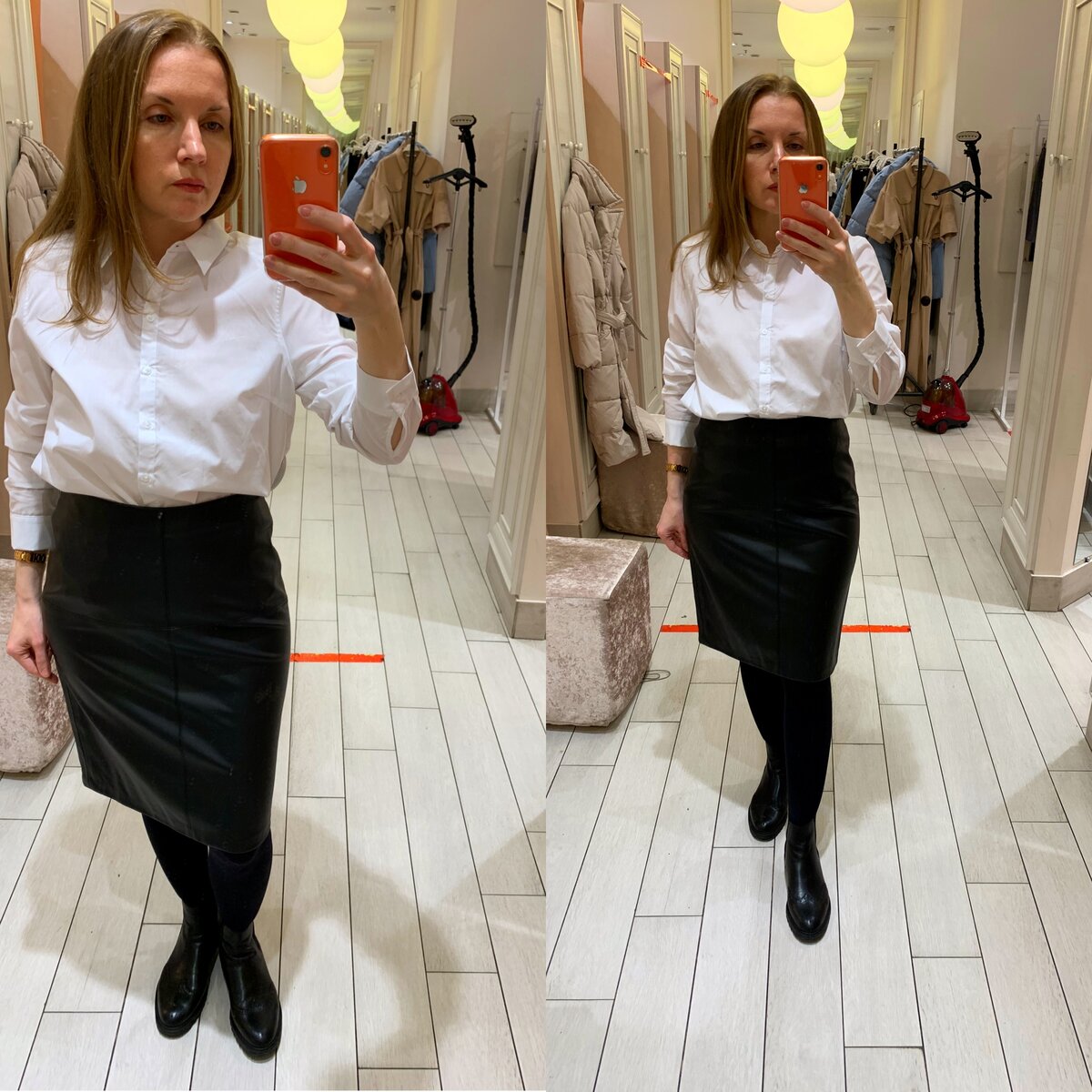 Выбрала юбку из эко-кожи , рубашку белую и свитер .